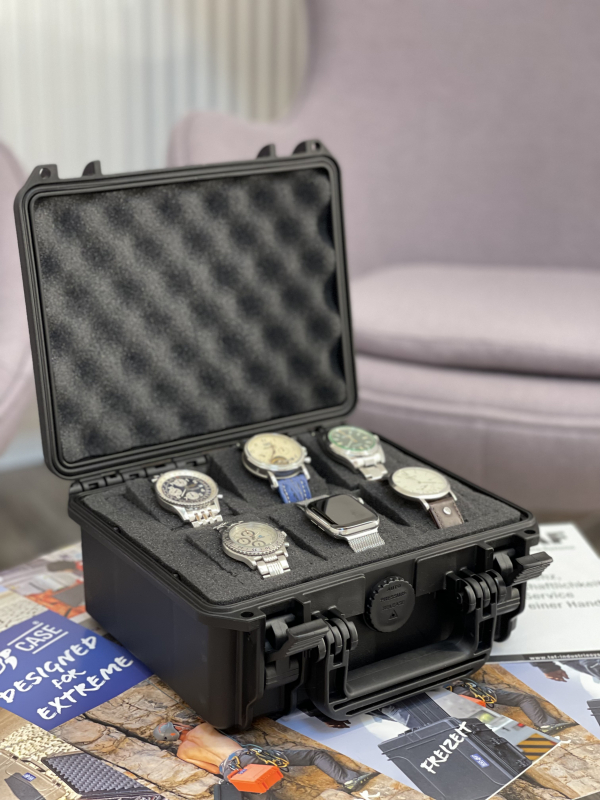 Durch die individuell anpassbaren Schaumstoffeinlagen welche es ermöglichen, die Uhren schonend jedoch sicher gegen verrutschen zu sichern, eignet sich der Uhrenkoffer für Uhren in nahezu allen Größen. Somit können auch empfindliche Automatikuhren, sicher in verschiedenste Outdoorbereiche mitgenommen werden.